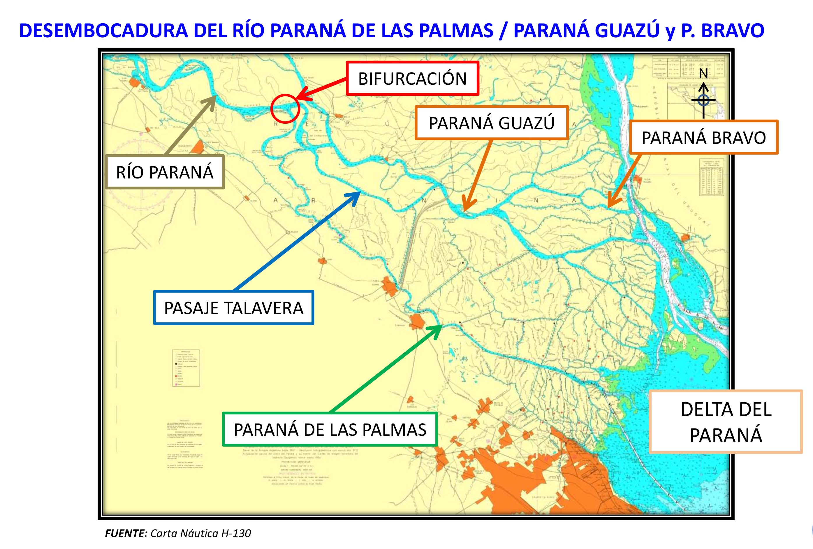 Por la cartografía acompañada en estos tres libros, se refleja que el río Paraná se bifurca en el kilómetro 231. Un 77% de su caudal se dirige al Paraná Guazú que es su afluente principal, y solo un 23% a la vía secundaria del Paraná de las Palmas por dónde se encuentra el Canal Emilio Mitre.