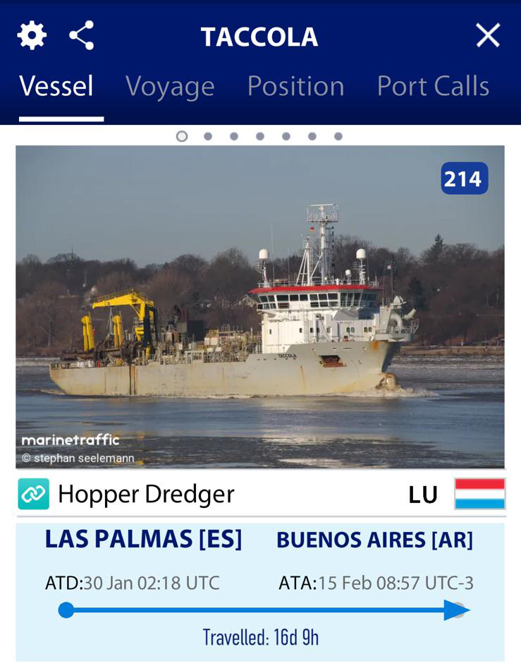 El caso de la draga “Toccola” es más complejo. Habiendo astilleros argentinos en capacidad de realizar las reparaciones que requeriría en tiempo y forma, Jan De Nul optó por enviarla a un astillero en Portugal. Para tal fin, partió el 24 de octubre de 2023 para regresar al país el 14 de febrero de 2024. Estuvo por tanto casi cuatro meses fuera de la Argentina y ahora se encuentra amarrada sin operar.