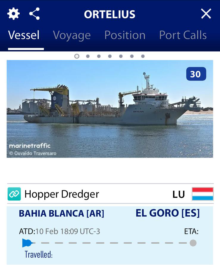Otro gigante, como la draga “Ortelius”, también quitó la hidrovía con rumbo a Montevideo el 24 de enero de 2024 y luego se dirigió al puerto de Bahía Blanca donde está operando en la actualidad.