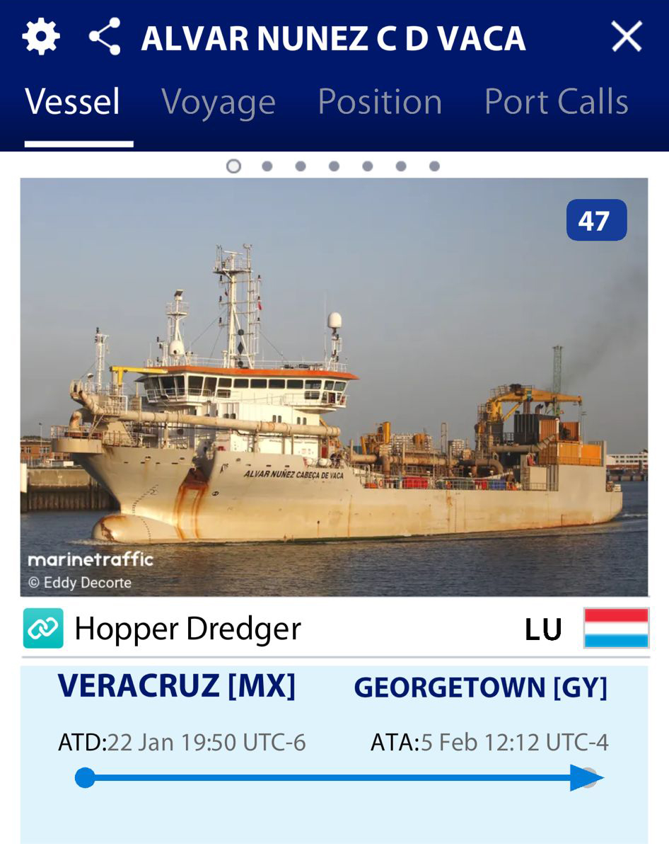 La mega draga “Alvar Núñez Cabeza de Vaca” partió en julio de 2023 con destino a Países Bajos y hoy está en las proximidades de Trinidad y Tobago.